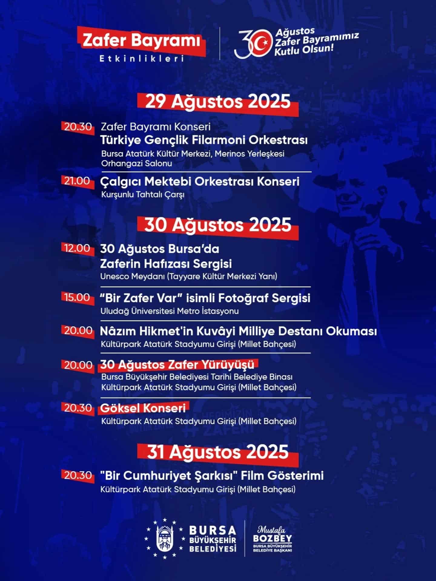 30 Ağustos Cumartesi günü ise saat 12.00’de UNESCO Meydanı’nda ’30 Ağustos Bursa’da Zaferin Hafızası’ segisi, saat 15.00’de Uludağ Üniversitesi Metro İstasyonu’nda ‘Bir Zafer Var’ fotoğraf sergisi izlenime sunulacak. ’30 Ağustos Zafer Yürüyüşü’ ise saat 20.00’de Bursa Büyükşehir Belediyesi Tarihi Belediye Binası önünden başlayarak Kültürpark Atatürk Stadyumu girişine (Millet Bahçesi) kadar sürecek. Nâzım Hikmet’in Kuvâyi Milliye Destanı’nın okunacağı Millet Bahçesi’nde, sevilen sanatçı Göksel’in sahne almasıyla coşku doruğa çıkacak. 31 Ağustos Pazar günü ise saat 20.30’da Kültürpark Atatürk Stadyumu girişinde ‘Bir Cumhuriyet Şarkısı’ film gösterimi yapılacak.
