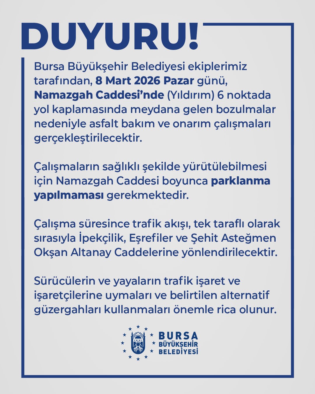 Belediyeden yapılan duyuruya göre, çalışmaların aksamaması ve sağlıklı bir şekilde tamamlanabilmesi için Namazgah Caddesi boyunca parklanma yapılması kesinlikle yasaklandı. Araç sahiplerinin mağduriyet yaşamaması için cumartesi gecesinden itibaren önlem almaları istendi.